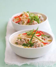 Cuire les nouilles et réserver. Préparer les boulettes en mélangeant la viande hachée, la moitié des ciboules hachées, le piment égrainé et coupé finement (attention aux...