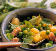 Faites revenir rapidement les lardons et la carotte coupée en petits dés dans le beurre dans une cocotte. Ajoutés les petits pois, les pommes de terre...