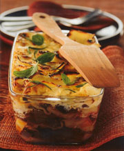 Préchauffez le four à 180° (th.6). Coupez les aubergines et les tomates en dés. Pelez les oignons et coupez-les en petits dés. Versez l'huile d'olive dans...
