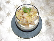 Enlever la peau du poisson, ôter les arêtes. Débiter la chair en petits dés. La parfumer avec l’huile de pistache (ou une bonne huile d'olive),...