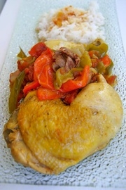 Saisissez les morceaux de poulet dans la cocotte. Salez et poivrez. Ajoutez le jambon coupé en allumettes et le piment. Remuez puis réservez. Faites fondre les oignons...