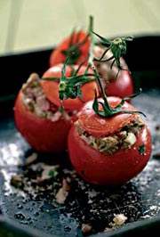 Laver, enlever le couvercle, vider et saler les tomates. Mixer le reste des ingrédients. Vérifier l'assaisonnement. Remplir les tomates et dresser sur un lit de...