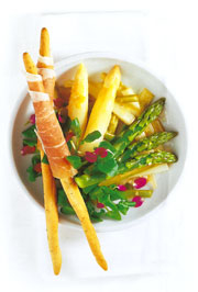 Peler le tiers inférieur des asperges. Faire cuire les asperges blanches à la vapeur durant 5 min. puis ajouter les vertes. Poursuivre la cuisson à la...