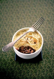 Préparation du velouté: Porter le bouillon et le lait à ébullition, ajouter le céleri et la pomme de terre coupés en dés, assaisonner et laisser mijoter...