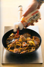 Faites chauffer l'huile dans le wok. Puis ajoutez les oignons et faites-les revenir 3 minutes. Ajoutez le porc et faites-le sauter par petites quantités jusqu'à ce qu'il soit doré (3 minutes environ par fournée). Retirez le tout du wok. Puis versez le vinaigre toujours dans le wok, et faites chauffer quelques instants en grattant le fond avec une cuillère en bois.